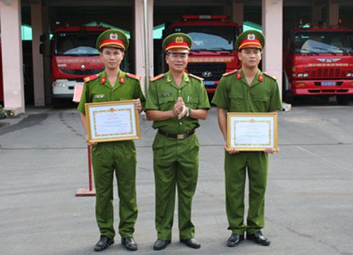 Đại tá Huỳnh Văn Quý (giữa), Phó Giám đốc Cảnh sát PC&CC tỉnh trao giấy cho 2 cá nhân đã có thành tích xuất sắc trong công tác cứu nạn, cứu hộ