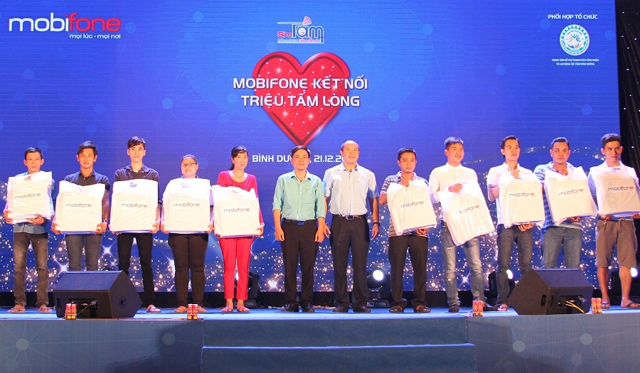 Ông Đỗ Văn Phùng, Phó Giám đốc Trung tâm HTTNCN & LĐT cùng đại diện công ty Mobifone tặng quà cho các công nhân vượt khó lao động giỏi