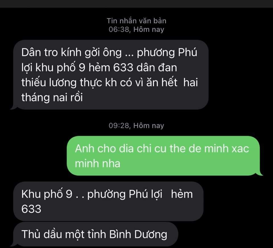Trước đó, vào ngày 10-8, ông N. nhắn tin vào đường dây nóng với nội dung: "Dân trọ kính gửi ông... phường Phú Lợi, tại khu phố 9, hẻm 633 dân thiếu lương thực, không có gì ăn hết hai tháng nay rồi".