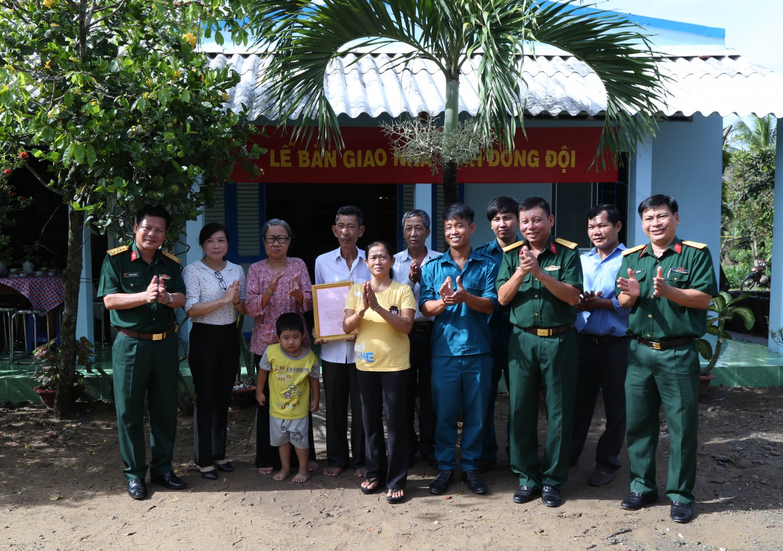 Đại diện Quân đoàn 4, Ban Chỉ huy Quân sự huyện Gò Công Tây và các ban, ngành địa phương chụp ảnh với gia đình trong lễ bàn giao nhà