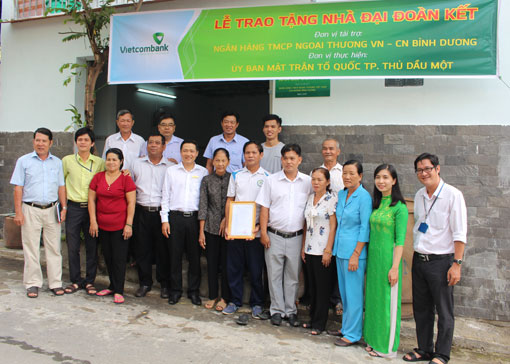 Ngày 13-10, Ngân hàng TMCP Ngoại thương Việt Nam chi nhánh Bình Dương (Vietcombank Bình Dương), phối hợp cùng Ủy ban Mặt trận Tổ quốc Việt Nam TP.Thủ Dầu Một đã tổ chức trao tặng căn nhà Đại đoàn kết cho hộ ông Nguyễn Văn Sang (SN 1962), là hộ có hoàn cảnh khó khăn về nhà ở ngụ tại khu phố 4, phường Phú Thọ, TP.Thủ Dầu Một. Căn nhà có diện tích xây dựng gần 60m2; kết cấu xây dựng gồm gác lửng, tường xây tô, mái lợp tôn, nền lát gạch cùng công trình phụ. Kinh phí xây dựng nhà do Quỹ Vì người nghèo TP Thủ Dầu một vận động Vietcombank Bình Dương tài trợ chính với 50 triệu đồng, số còn lại do các nhà mạnh thường quân khác cùng tham gia hỗ trợ.