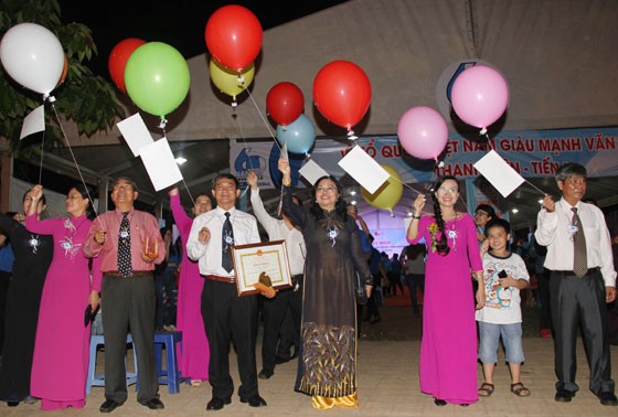 Ông Nguyễn Long Hải (thứ 6 từ phải qua), Bí thư Ban chấp hành Trung ương Đoàn và ông Nguyễn Văn Lộc (thứ 9 từ phải qua), Tỉnh ủy viên, Bí thư Thị ủy Dĩ An trao giải thưởng Hồ Văn Mên đến 14 học sinh, sinh viên vượt khó học giỏi.